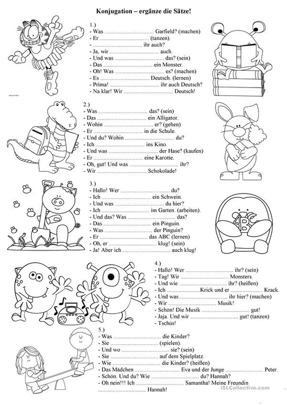 Arbeitsblatt für Anfänger miit Ausmalbildern! Die Schüler sollen einfache Sätze mit richtig konjugierten Verben ergänzen. Nicht alle Verben sind angegeben, die Schüler sollen auch wissen wo was fehlt! - DaF Arbeitsblätter