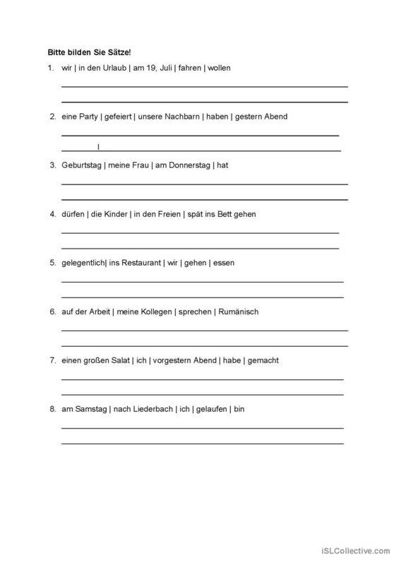 Die Schüler sollen aus verschiedenen Komponenten zwei verschiedene Versionen eines Aussagesatzes bilden. Dabei soll einmal das Subjekt vorne stehen und das andere Mal die temporale / lokale Satzergänzung. Dabei bestehen die Komponenten teilweise aus zusammengehörenden, mehreren Wörtern.
