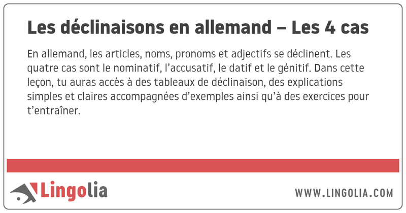 En allemand, les articles, noms, pronoms et adjectifs se déclinent. Les quatre cas sont le nominatif, l’accusatif, le datif et le génitif. Dans cette leçon, tu auras accès à des tableaux de déclinaison, des explications simples et claires accompagnées d’exemples ainsi qu’à des exercices pour t’entraîner.
