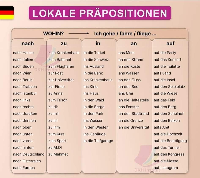 Sprakukos DaF/DaZ-Blog. Deutsch lernen. Übungen und Aufgaben. Interaktive Übung zu den lokalen Präpositionen A1/A2: nach, in, aus, von, bei, zu, auf, an. Woher komme ich? Wo bin ich? Wohin gehe/ fahre oder fliege ich? Achten Sie auf den Artikel und den Kasus. Akkusativ oder Dativ?